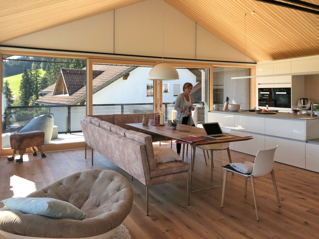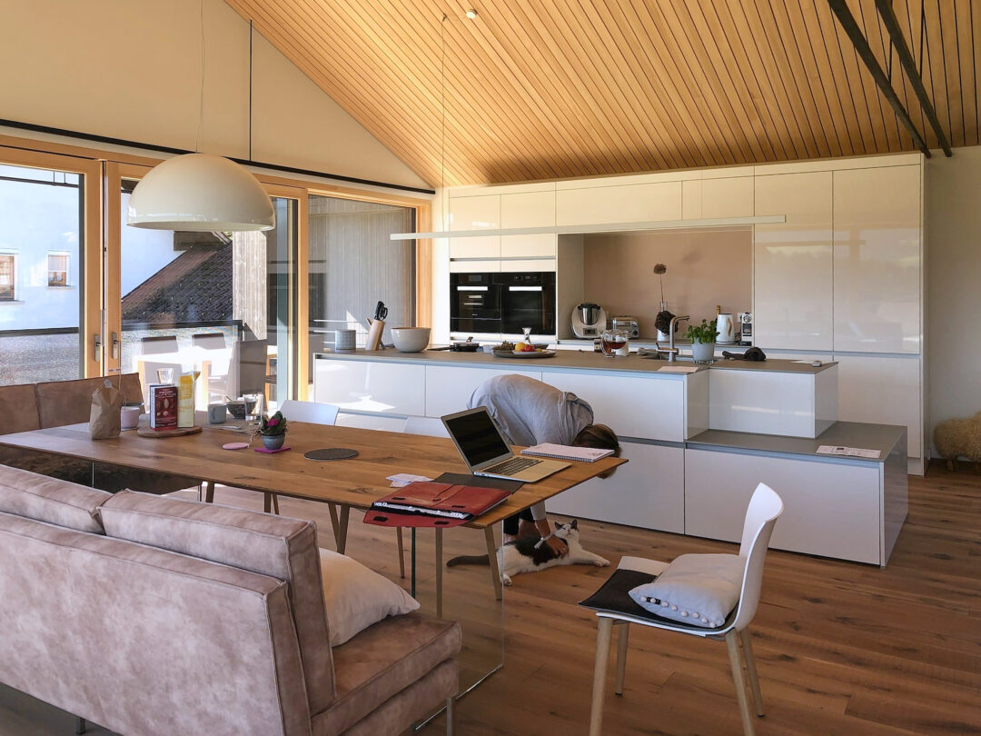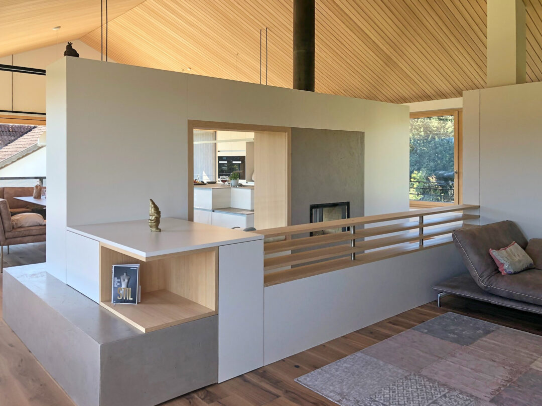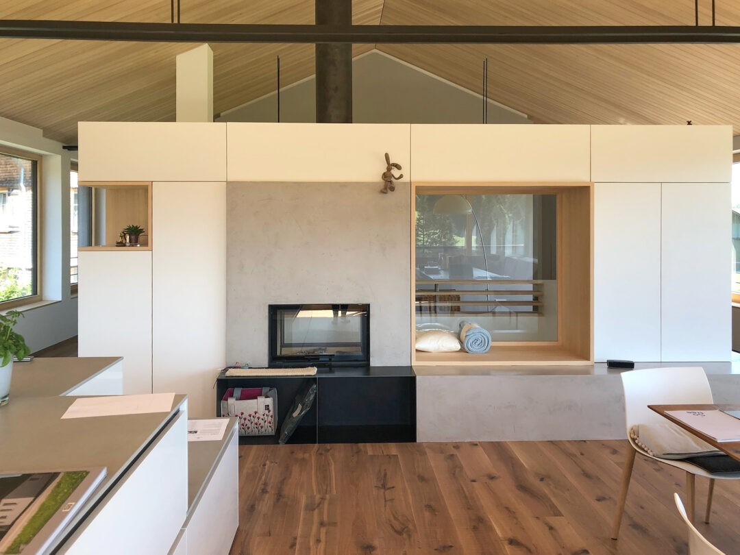 Der Dachstuhl eines alten Bauernhauses wurde durch einen modernen Aufbau in typischer Vorarlberger moderner Architektur aufgestockt. Meine Aufgabe bestand darin, im Raum ein Zentrum zu schaffen und die bestehende Treppe so zu integrieren, dass sie den Raum nicht trennt, sondern verbindet. Ich gestaltete ein Konzept, das Wohn -und Essbereich durch eine Glasnische verbindet, gleichzeitig Stauraum und individuelle Wohnbereiche schafft.